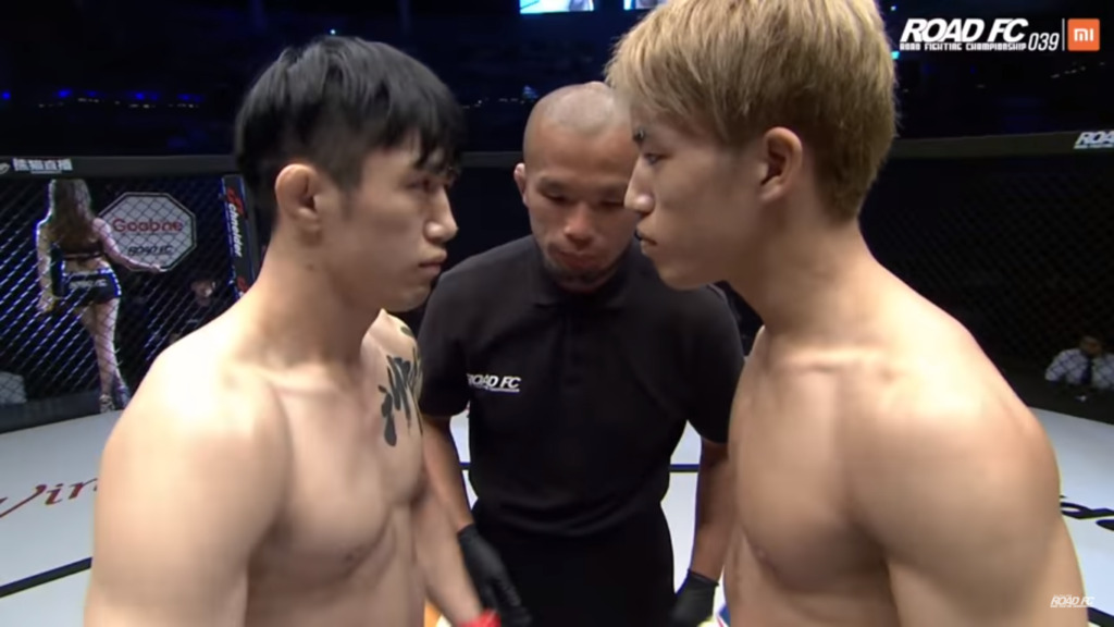 That exchange got the crowd on its feet, and the fact it was their countrymen on the offensive certainly helped. Asakura continues to pressure, throwing single punches at the head and body of Moon. But the South Korean is using a very right-hand/legkick heavy gameplan and he’s beginning to land at a higher rate than he was 90-seconds prior.