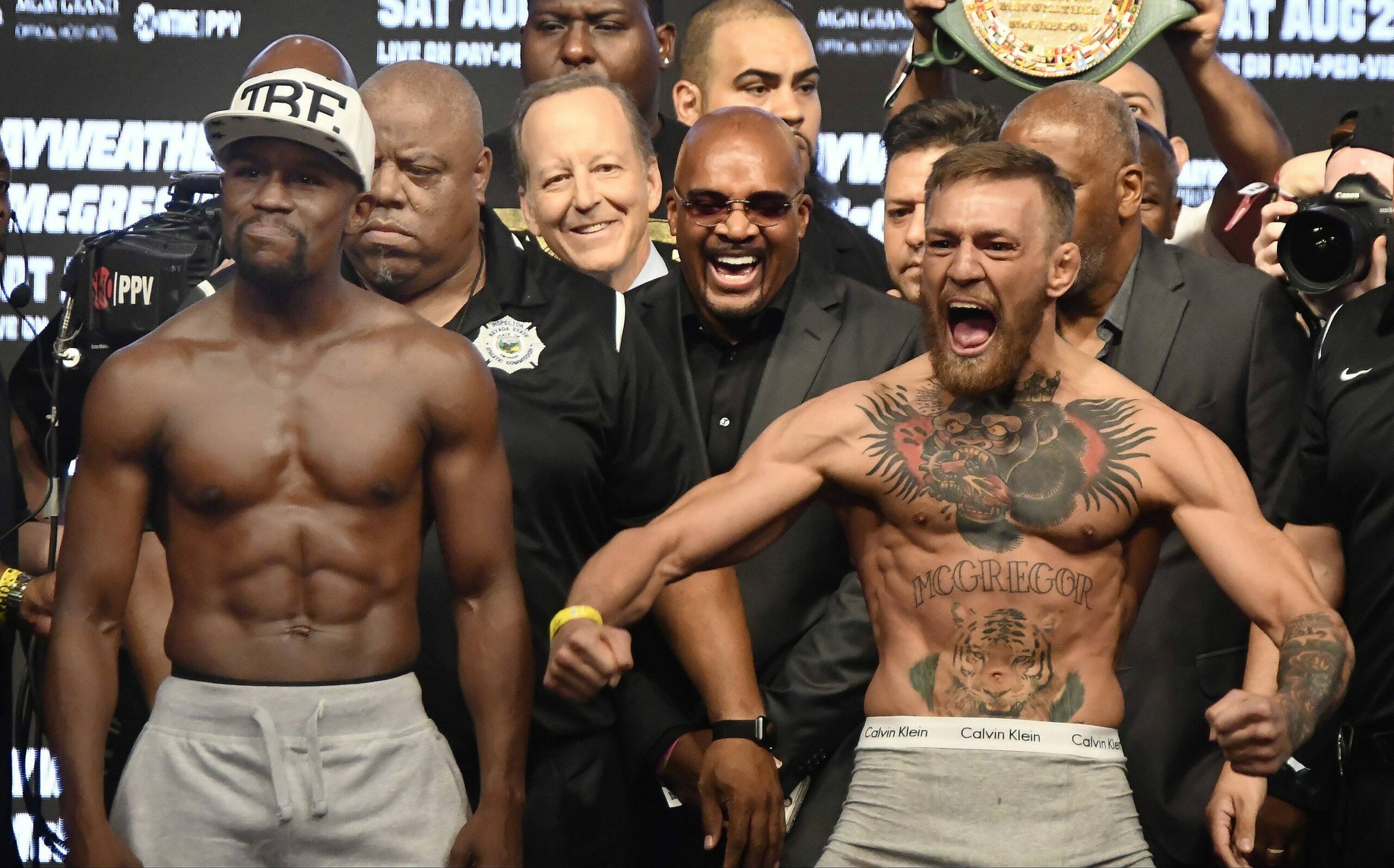 The fight was contested at 154lbs, a weight that would be McGregor’s lowest for two years. Mayweather took to the scales, hitting 149.5lbs. A big talking point as McGregor was always going to be the bigger man in the ring, however, as the Irishman weighed in at 153lbs, this was only made larger at the time. It would be the final time the two men set eyes on each other before taking to the ring. This was actually happening.