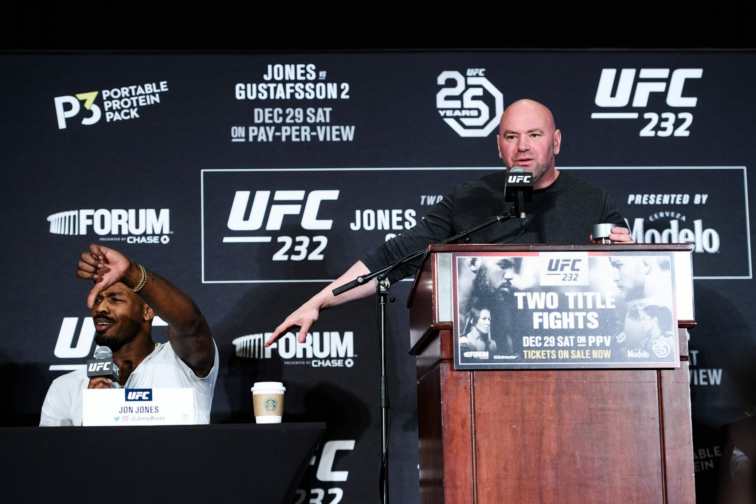 181227 Jon Jones and Dana White during a press conference PK Pressekonferenz for UFC 232 on December 27, 2018 in Los Angeles. *** 181227 Jon Jones and Dana White during a press conference for UFC 232 on December 27 2018 in Los Angeles, detectedSourceLanguage PUBLICATIONxNOTxINxDENxNORxSWExFINxAUT Copyright: SIMONxHASTEGüRD BB181227SH049