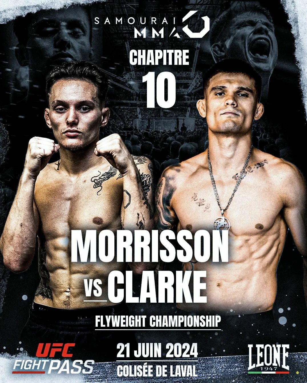 Undefeated Tommy Morrisson (6-0 MMA, 6-0 Samourai MMA) takes on CFFC veteran James Clarke (9-3 MMA, Samourai MMA promotional debut), a five-round fight at five minutes per round.