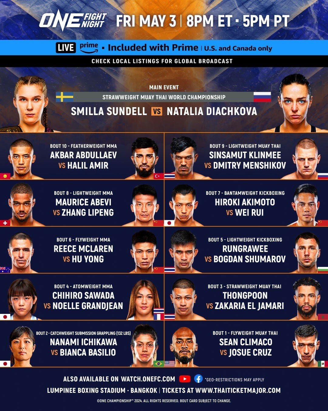 Main Event: Smilla Sundell def. Natalia Diachkova by TKO (Punches) at 2:59 into Round 2, ineligible to win Vacant ONE Strawweight Muay-Thai Championship. Catchweight: 126.5 lbs. (Sundell missed weight)