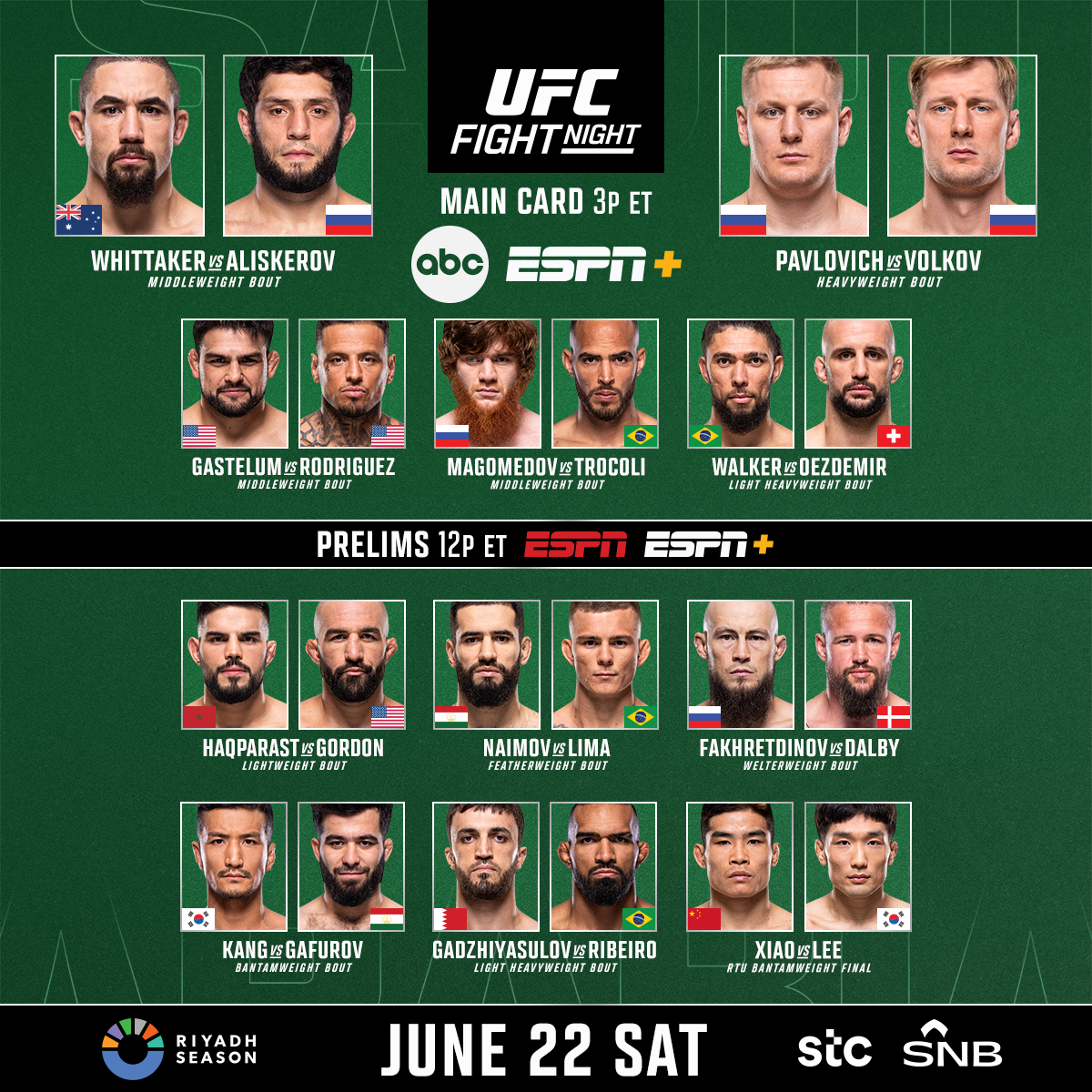 Topping the bout order is the UFC on ABC 6 main event, a middleweight fixture between No. 3 contender Robert Whittaker (25-7 MMA, 16-7 UFC) and Ikram Aliskerov (15-1 MMA, 2-0 UFC). It’s a five-round affair at five minutes per round.